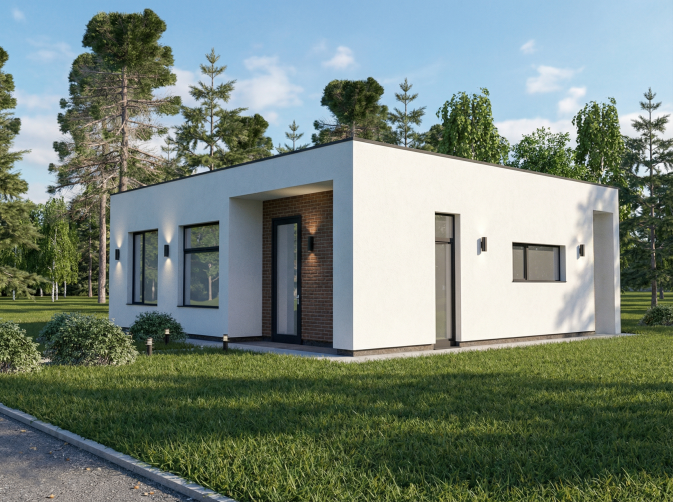 Современный дом от застройщика «ДМ Групп». Кухня-гостиная с панорамными окнами, выходом на террасу и две спальни создают комфортное пространство для жизни.
